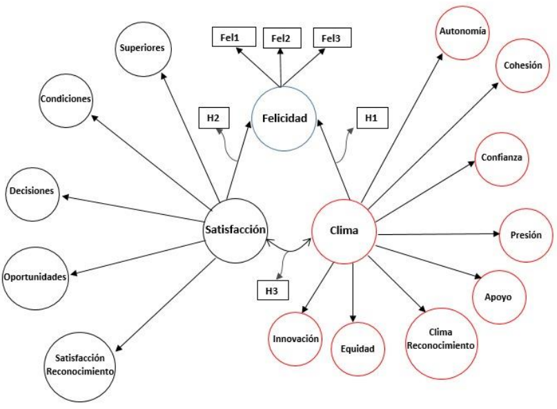 Del estudio se derivan las siguientes Hipótesis, H1: Experimentar clima laboral favorable conlleva mayor felicidad subjetiva; H2: La satisfacción laboral se relaciona positiva y significativamente con la felicidad subjetiva; H3: Existe una correlación positiva y significativa entre la satisfacción laboral y el clima organizacional.