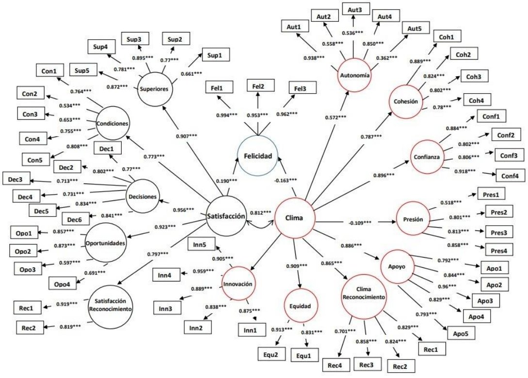Figura 2 Modelo Estructural, Relación completa de los componentes de la satisfacción laboral y clima organizacional sobre la Felicidad subjetiva en el modelo estructural propuesto