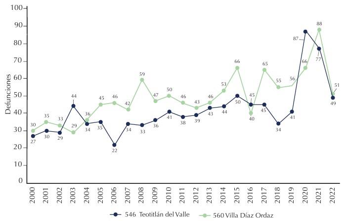 Las hospitalizaciones en los municipios durante los años 2020 y 2021 fueron escasas, quizá por la falta de acceso efectivo a los servicios de salud, por la negativa de los individuos a asistir a las unidades hospitalarias, o por la imprecisión de los datos. En cualquier caso, en 2020 sólo se reportaron una hospitalización en Teotitlán del Valle y una en Villa Díaz Ordaz, mientras que en 2021 se registraron una y tres, respectivamente. En 2022 no se contó con reportes de personas hospitalizadas en ninguno de los dos municipios (véase el Cuadro 3).