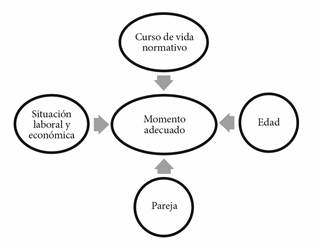 Una trama repetida, a la que hicieron referencia incluso algunas de las mujeres sin hijos, es aquella en la que la decisión ocurre o tendría que ocurrir en el marco de un momento percibido como adecuado. La “adecuación” del momento se construye en la narrativa hilando diversos ámbitos de vida: laboral, familiar, educativo, salud, principalmente. La siguiente figura sintetiza las dimensiones usadas para dar cuenta de la “adecuación” del momento.