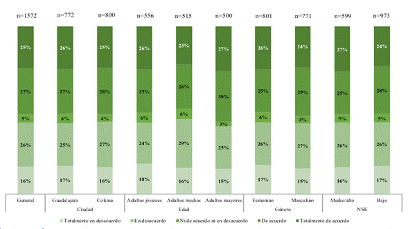 Como se observa, hay una gran diferencia entre las opiniones vertidas en Francia y en Colima y Guadalajara. Como se vio en la EIRP, los adult@s medios son quienes muestran el mayor desacuerdo, y son los hombres quienes adelantan ligeramente a las mujeres. De cualquier forma, es apabullante el resultado a favor de esta afirmación en ese país, dado que el 69 por ciento en promedio de los respondientes mostró su acuerdo, frente al 52 por ciento de nuestra encuesta. Hay que tomar en cuenta que aquella fue levantada en 2006 y la nuestra en 2021. Quince años después el resultado con seguridad sería diferente.