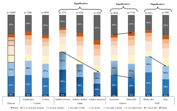 En términos generales se coloca en primer lugar el usar ropa sexy con 66 por ciento, enseguida el usar juguetes sexuales con 43 por ciento, y ver videos o pornografía juntos así como usar productos que estimulan se ubican en tercer lugar con 39 por ciento. Tomando en cuenta las diferencias venidas del género, el NSE y la ciudad, ver videos de pornografía juntos destaca que los hombres lo hacen mucho más que las mujeres, un 45 por ciento frente a un 35 por ciento, hallazgo que coincide plenamente con lo revelado en trabajo cualitativo con entrevistas, aunque se percibe una cierta tendencia a que aumente el gusto entre las mujeres. En lo que toca a intercambiar mensajes escritos eróticos o sexuales se revela mucha mayor actividad entre los mayores con un 43 por ciento, frente a un 33 por ciento de los jóvenes, y 31 por ciento de los medios; mientras que el NSE medio/alto adelanta al bajo con un 38 por ciento frente a 31 por ciento. En el uso de juguetes sexuales destacan los jóvenes con un 47 por ciento, frente a 39 por ciento de los medios y 40 por ciento de los mayores, lo cual llama la atención pues al preguntar sobre esta práctica concreta en la sección anterior, el uso era de 21 por ciento entre los jóvenes, el 15 por ciento entre los medios y apenas el 13 por ciento entre los mayores, de las respuestas totales de la EIRP; mientras que lo que se presenta aquí corresponde sólo al 21 por ciento que ha emprendido prácticas para estimular la vida sexual. Por lo que toca a la distinción por género, usar juguetes sexuales lo afirman 42 por ciento de las mujeres y 44 por ciento de los hombres. Respecto a usar ropa sexy, la opción más frecuente en general, se revela mayor uso en Colima que en Guadalajara, 71 por ciento frente a 63 por ciento; y la usan más los jóvenes y los medios con un 68 por ciento, que los mayores, con un 61 por ciento. En cuanto al uso de productos que estimulan, Guadalajara adelanta a Colima con un 45 por ciento frente a un 35 por ciento; en los grupos de edad va creciendo de 35 por ciento a 38 por ciento, y 49 por ciento con los mayores; los hombres adelantan a las mujeres con un 42 por ciento frente a 37 por ciento; y el NSE alto revela menor uso que el bajo, 38 por ciento frente a 40 por ciento. Acerca de la acción de hablar por teléfono de fantasías y deseos, Guadalajara adelanta por seis puntos a Colima, 26 por ciento frente a 20 por ciento; los adult@s medios lo hacen mucho más que los otros, 29 por ciento frente a 23 por ciento de los jóvenes y 17 por ciento de los mayores; y los hombres adelantan con mucho a las mujeres con un 31 por ciento frente a un 17 por ciento.