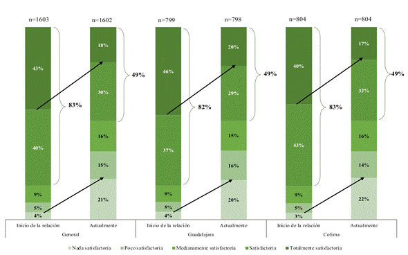 De aquellos que tienen una vida sexual activa, sólo alrededor de la quinta parte respondió en la opción más intensa de las ofrecidas, que es totalmente satisfactoria, tanto a nivel general como en ambas ciudades. El mayor porcentaje de las respuestas se reportó en la opción sólo satisfactoria, rondando el 30 por ciento. Mientras que la opción más negativa, la que dice nada satisfactoria, aparece en la quinta parte de las respuestas. Si se sumaran las opciones totalmente satisfactoria y satisfactoria, se tendría que apenas llegan a la mitad. Es claro que aun teniendo una vida sexual activa, ésta deja poco o mucho que desear para la mitad de los respondientes.