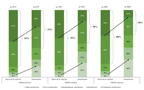 Ahora, en el gráfico 5 se muestra la comparación de los resultados respecto a la satisfacción con la vida sexual al inicio de la relación y actualmente, por grupos de edad.