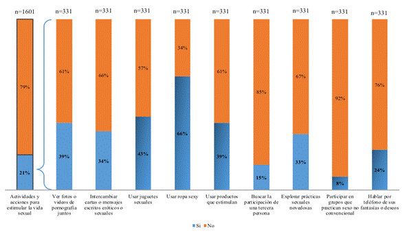 Al observar lo relativo a si el respondiente ha recurrido a algunas actividades para estimular su vida sexual, el resultado es que sólo 21 por ciento lo han hecho, frente a 79 por ciento que no. Esa pregunta es interesante pues revela el tipo de actitud que el individuo asume ante una vida sexual desgastada o por debajo de sus expectativas. En los resultados por ciudades se descubre mayor apertura en Guadalajara que en Colima, 23 por ciento en respuesta afirmativa frente a un 18 por ciento. La distinción por edad es muy relevante, ocurriendo un 28 por ciento en los adult@s jóvenes, un 19 por ciento entre los medios y sólo un 15 por ciento entre los mayores. En cuanto al género no hay una diferencia significativa, apenas una diferencia de 21 por ciento entre las mujeres y de 20 por ciento entre los hombres, mientras que el NSE revela que el 25 por ciento del nivel medio/alto lo ha hecho frente un 18 por ciento en el bajo. Cabe mencionar que al comparar los grupos de edad por ciudad es de destacar que entre los jóvenes de Guadalajara ocurre un 33 por ciento, frente a un 22 por ciento de Colima, mientras que entre los medios no hay tanta diferencia -18 por ciento frente a 19 por ciento-, y entre los mayores de 16 por ciento a 13 por ciento. Al preguntar a los respondientes que sí han emprendido actividades para mejora su vida sexual (21 por ciento), cuáles en particular han realizado, resultó lo siguiente.