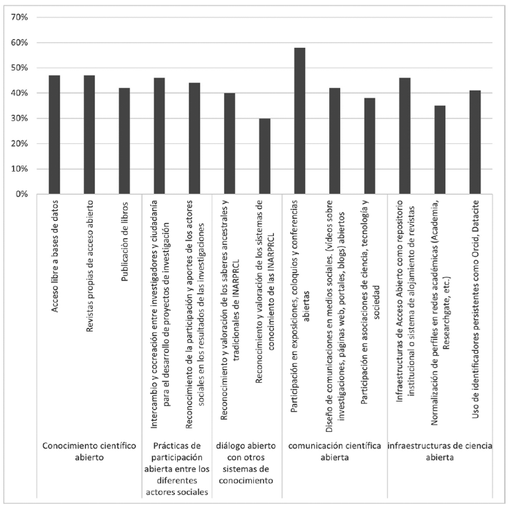 La primera de las variables abordadas en el cuestionario aplicado fue relativa a las prácticas institucionales de ciencia abierta más utilizadas. Las variables fueron organizadas con base en los componentes ‘Conocimiento científico abierto’, ‘Participación abierta entre los diferentes actores sociales’, ‘Diálogo abierto con otros sistemas de conocimiento’, ‘Comunicación científica abierta’ e ‘Infraestructuras de ciencia abierta’. Las prácticas de conocimiento científico abierto más usadas fueron el acceso libre a bases de datos (47 %), revistas institucionales en acceso abierto (47 %) y la publicación abierta de libros (42 %). Tales resultados confirman que estas prácticas ya venían utilizándose como parte de los procesos de investigación científica que no son necesariamente exclusivos de la ciencia abierta.