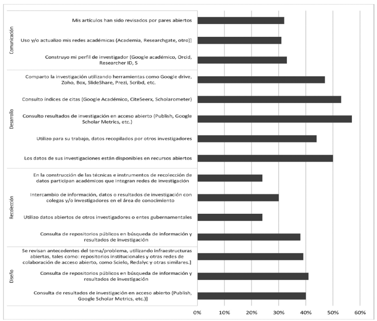 Las prácticas que los investigadores ocasionalmente utilizan en la etapa del diseño de la investigación es la construcción de la agenda de investigación con la ciudadanía interesada en los temas o problemas investigados (34 %); en la etapa de recolección, la réplica de métodos y técnicas similares a los disponibles en recursos abiertos (32 %); en el desarrollo de la investigación, la recolección de datos o información para el proyecto por algún actor de la sociedad (58 %); y en la de comunicación, los resultados de las investigaciones son usados por la ciudadanía (36 %).