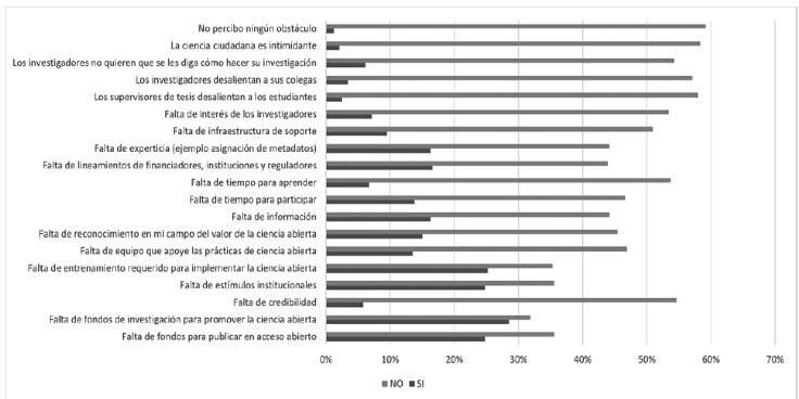 Frente a los obstáculos y barreras percibidas para la implementación de la ciencia abierta, desde la mirada institucional puede observarse que se requiere la voluntad política para hacerlo, pues los investigadores de las ciencias humanísticas tienen toda la facilidad para aplicarla.