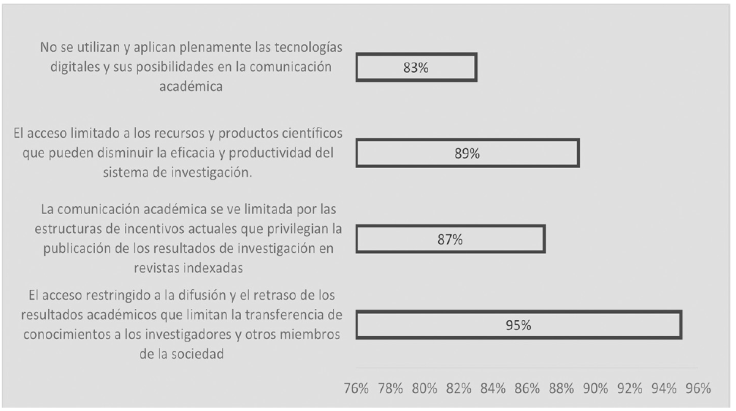 A propósito de las mayores deficiencias donde los investigadores se identificaron con las alternativas de respuestas ‘totalmente de acuerdo’ y ‘de acuerdo’ fueron en los rubros del acceso restringido a la difusión y el retraso de los resultados académicos que limitan la transferencia de conocimientos a los investigadores y otros miembros de la sociedad (95 %), en el acceso limitado a los recursos y productos científicos que pueden disminuir la eficacia y productividad del sistema de investigación (89 %) y en el hecho de que la comunicación académica es limitada por las estructuras de los incentivos actuales que privilegian la publicación de los resultados de investigación en revistas indexadas (87 %) (Figura 5).