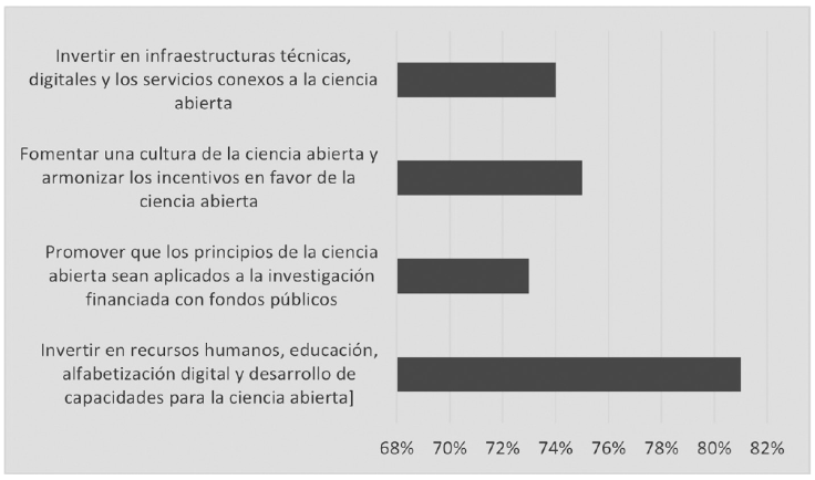 Finalmente, entre las acciones prioritarias por realizar para la implementación de la ciencia abierta están: invertir en recursos humanos, educación, alfabetización digital y desarrollo de capacidades para la ciencia abierta (81 %); promover que los principios de la ciencia abierta sean aplicados a la investigación financiada con fondos públicos (73 %); fomentar una cultura de la ciencia abierta y armonizar los incentivos en favor de la ciencia abierta (75 %); e invertir en infraestructuras técnicas, digitales y los servicios conexos a la ciencia abierta (74 %) (Figura 6).