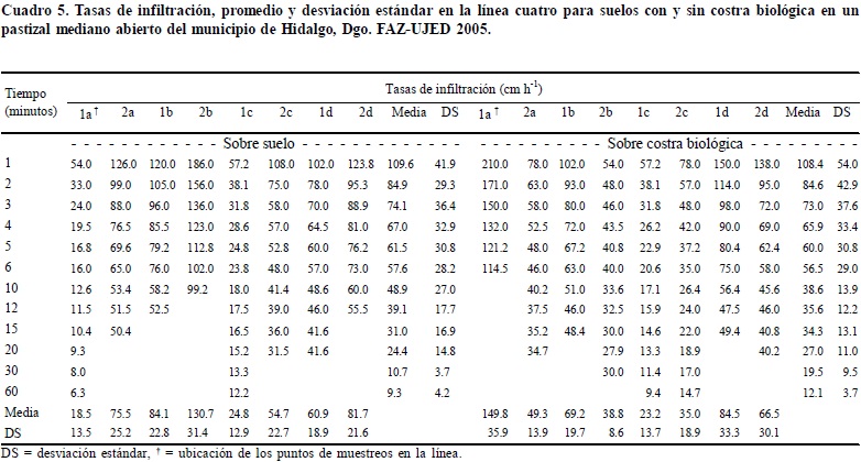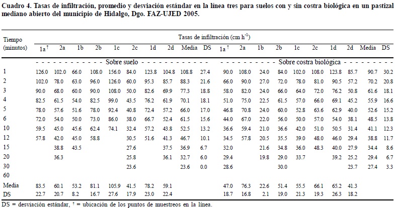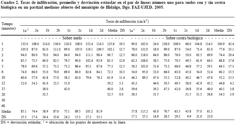 Los resultados en el análisis de varianza realizado en el presente estudio sobre los datos de infiltración de agua en el suelo con y sin costra biológica no sustentan la hipótesis de trabajo aquí planteada (Cuadro 1), así como las afirmaciones de algunos autores (Herrick et al. , 2005) de que estas costras mejoran las tasas de infiltración de agua en el pastizal. Solamente en el 28% de las pruebas realizadas en este estudio sobre costras biológicas resultaron con tasas que pudieran ser consideradas superiores a las calculadas para suelos sin costra biológica (Cuadros 2, 3, 4 y 5).