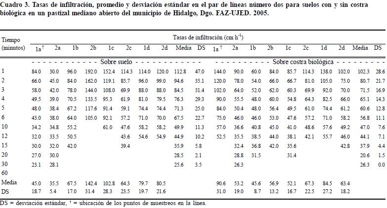 Las líneas fueron constituidas por cintas métricas de fibra. En ambos lados de cada línea y a distancias de 5, 10, 15 y 20 m dentro de la línea, y aproximadamente a un metro de ésta se realizaron pruebas de infiltración de agua, 64 en total. En forma alternada en cada línea (dos lados de la misma), la mitad de las pruebas se realizó sobre costra biológica y la otra mitad sobre suelo sin costra. Se utilizaron cuatro infiltrómetros de doble anillo, equipados con un cronómetro, un flotador y una escala en centímetros, ajustados para indicar el nivel del agua en el cilindro interior en cualquiera de los tiempos programados para realizar las lecturas y con dimensiones adaptadas para su uso en pastizales. Cada prueba consistió en programar el cronómetro para un tiempo máximo de una hora, se realizó la lectura en la escala sin agua en el cronómetro (lectura inicial), se llenaron los cilindros interior y exterior con agua y se procedió a iniciar el cronómetro para realizar las lecturas del nivel del agua a los siguientes tiempos: 1, 2, 3, 4, 5, 6, 10, 12, 15, 20, 30 y 60 minutos. En el caso de que se alcanzara la lectura inicial antes de la hora, se paró el cronómetro y se realizó la lectura exacta del tiempo transcurrido de la prueba. Se procuró realizar cuatro pruebas por vez (al mismo tiempo), la mitad en suelo sin costra y la mitad en suelo con costra, para evitar algún sesgo por aparato, lector y registrador y la hora del día.