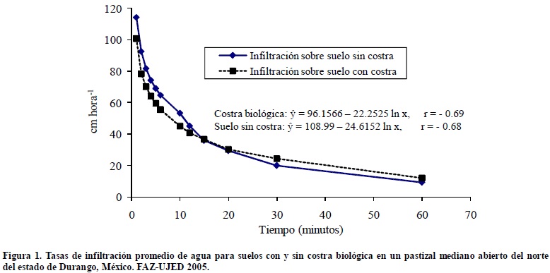 La tendencia de las tasas de infiltración en ambos ambientes fue la misma que es reportada por diferentes trabajos sobre infiltración en suelos de pastizales (Branson et al., 1981). La Figura 1 corresponde a las tasas de infiltración en los suelos con y sin costra. En ésta se observa que en los primeros minutos de la prueba (10 a 15 minutos) las tasas son en promedio superiores en los suelos sin costra que en los que estaban cubiertos por la costra biológica, sin embargo, después de los 20 minutos de iniciada la prueba, la tasa de infiltración es mayor en el suelo con costra biológica. Una explicación a este resultado, es probablemente la que mencionan Branson et al. (1981), la técnica del infiltrómetro del doble anillo carece del simulador del impacto de la gota de lluvia así como de la intensidad de la precipitación, factores importantes en la infiltración de agua de lluvia en el suelo, donde la costra biológica tiene función protectora sobre el impacto de la lluvia y la erosión causada por la escorrentía así como la disminución de la velocidad de ésta lo que causa más infiltración (Warren, 2001). Asimismo, las costras biológicas estuvieron expuestas a disturbio por diferentes factores como el pisoteo por el ganado doméstico, el cual es el disturbio más común causado por los animales en pastoreo (Belnap y Eldridge 2001; Warren y Eldridge, 2001).