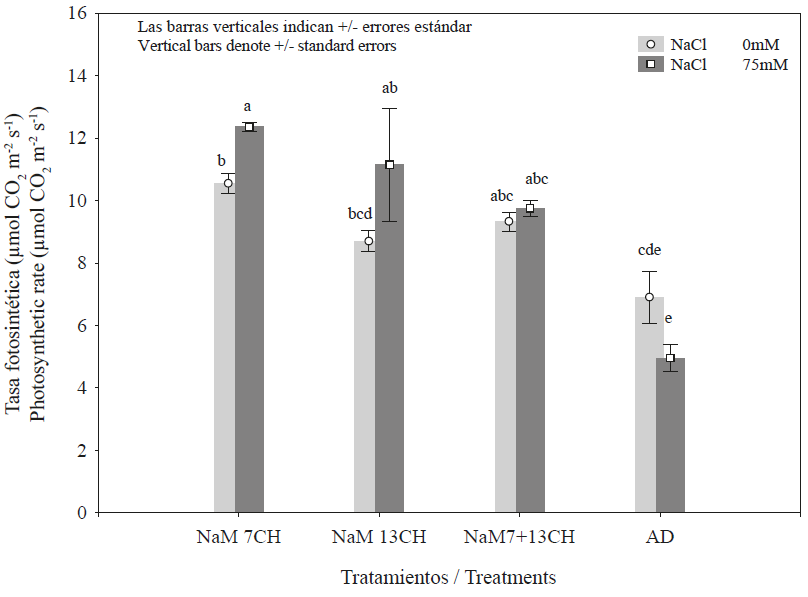 Among the groups of treated plants, the one with greater TF was that with the NaM-7CH treatment in salinity stress (75 mM of NaCl) conditions, whose plants experimented an increase higher than 50% in this variable (Figure 1), compared with the control group (AD). These results can be justified because NaM-7CH contains nanoparticles of the active ingredient (sea salt), which is formed by oligoelements, such as magnesium, essential for the chlorophyll molecule that plays a priority role in photosynthesis (Mazón-Suástegui et al., 2018). In a similar research study in bean (Vigna unguiculata L. Walp.) plants subjected to salinity stress and treated with the homeopathic medicine Sepia sucus for human use, positive responses were obtained, such as a significant increase in growth, content of sugar, chlorophyll, proteins and relative content of water in comparison to the control group without homeopathy (Sukul et al., 2012).