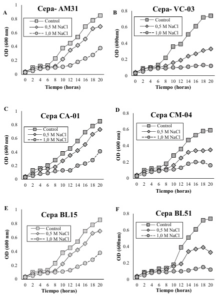 De las cepas previamente purificadas, se hicieron crecer en medio de cultivo LB líquido durante 72 horas en agitación orbital a una temperatura de 28 °C. Transcurrido el tiempo de incubación, se procedió a generar un medio de cultivo LB con adición de cloruro de sodio (NaCl) a concentraciones de 0.5 M y 1.0 M. Posteriormente, se transfirieron 200 microlitros de las cepas desarrolladas, ajustadas a una concentración de 1×1010 UFC mL-1. Estos cultivos se incubaron durante 20 horas, capturando datos de crecimiento a 600 nm en un espectrofotómetro marca HACH modelo DR 3900, en intervalos de 2 horas. Todas las cepas se compararon con un control sin adición de NaCl.