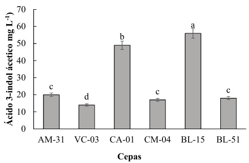 Las cepas en estudio presentaron variaciones significativas en la producción de IAA, destacándose la cepa BL-15 con la mayor producción, alcanzando un promedio de 60 mg L-1 lo que es significativamente más alto que todas las otras cepas, por otra parte, la cepa CA-01 alcanzo una producción de alrededor de 50 mg L-1. En concordancia con el estudio de Oleńska et al. (2020) se establece que al producir AIA, las rizobacterias pueden promover un ambiente más favorable para el establecimiento de una relación simbiótica con la planta huésped. Por lo tanto, Saeed et al. (2021) determina que las plantas, a su vez, pueden proporcionar a las bacterias nutrientes y un ambiente protegido en la rizosfera. Santoyo et al. (2021b) establece que esta relación mutuamente beneficiosa mejora la supervivencia y proliferación de las rizobacterias.