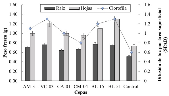 En cuanto al peso fresco de las hojas, la cepa CM-04 destaca con el valor más alto de aproximadamente 1.3 g, seguida de las cepas VC-03 y BL-15 con valores cercanos a 1.2 g. La cepa AM-31 presenta el menor peso fresco de hojas con aproximadamente 1.0 g. El control tiene un valor intermedio de alrededor de 1.1 g. esto coinciden con lo reportado por Khoshru et al. (2020) quien señala que algunas rizobacterias tienen la capacidad de solubilizar nutrientes en el suelo, como el fósforo y el potasio, convirtiéndolos en formas más disponibles para las plantas. Ashfaq, Hassan, Ghazali, y Ahmad (2020) demostraron que estas bacterias solubilizadoras mejoran el suministro de nutrientes esenciales logrando aumentar la tasa fotosintética y la producción de biomasa foliar.