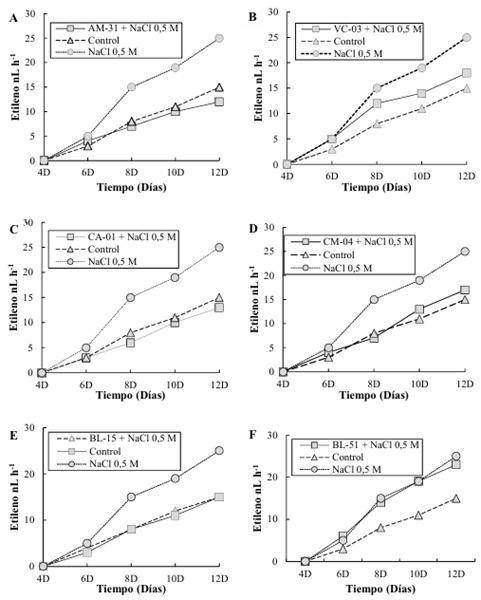 Finalmente, para la cepa BL-51 (Figura 4F), la producción de etileno bajo NaCl 0.5 M es aproximadamente 17 ηL L-1 a los 120 días, en comparación con el control que produce alrededor de 15 ηL L-1. La condición de NaCl 0.5 M sin bacterias muestra una producción similar a otras cepas, con alrededor de 25 ηL L-1. Oleńska et al. (2020) demostró que además de reducir los niveles de etileno, las rizobacterias pueden producir otras fitohormonas como citoquininas y giberelinas, que contrarrestan los efectos negativos del etileno y promueven el crecimiento vegetal.