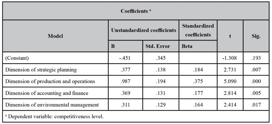 In the second stage of the research, a traditional multiple regression analysis was conducted with the objective of finding which of the dimensions analyzed tends to have more influence on the competitiveness of companies. To that end, the “competitiveness of the company” was selected as the dependent variable; it consists of questions concerning the “competitive situation over the rest of the sector”, the “frequency in the use of competitive strategies”, and the “incorporation of innovation and improvements across the company”. To build this variable, the same procedure described above was used, which made it possible to find the overall competitiveness value of the company measured on a scale from 1 to 5─very low to very high.