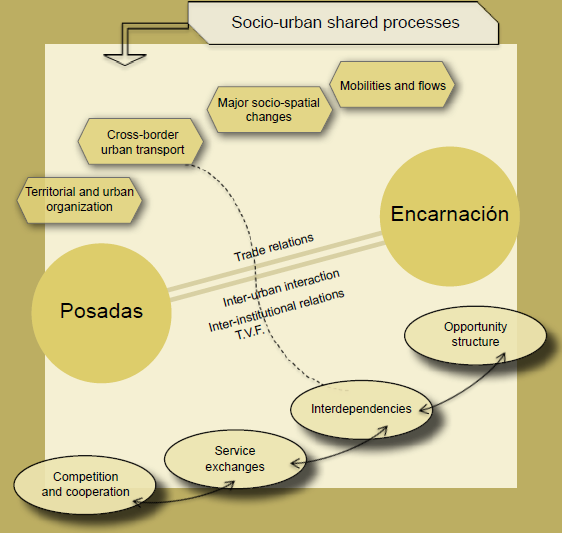 Posadas and Encarnación, as cross-border urban spaces, are complex scenarios that represent a challenge in regard to understanding social interrelations, interdependency links and complementary processes of socio-urban articulation. Geographical proximity has socio-spatial effects on both cities, while enabling opportunity structures on either side of the border: capitals, jobs, land, public and/or private services, shops, etc.-these items add to the long history of interconnection and shared socio-cultural processes.