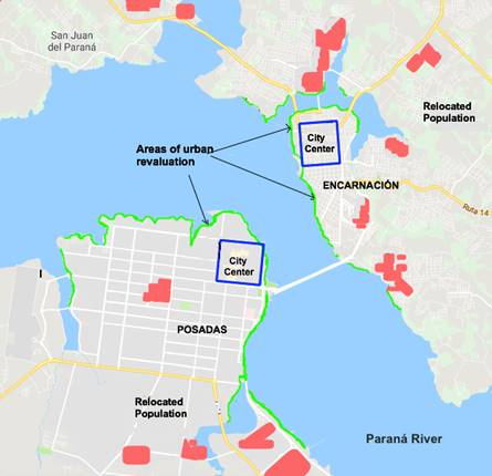Posadas, Argentina and Encarnación, Paraguay are cities with developments that mutually imply each other and connected socio-urban processes. They have a sustained multipurpose relationship and undergo reciprocal conditioning. In addition, these cities have several shared characteristics, which integrate them in a unique way through a cross-border conurbation. First, these are medium-sized border cities; one of them is the capital of the province and the other of the department, respectively, they have developed a conurbation process, driving the urban dynamics of smaller neighboring cities. Secondly, another unique feature refers to the opening of the San Roque González de Santa Cruz International Bridge, which connects the two cities. This bridge created an international urban corridor, making it possible to overcome the adversities of the Paraná River and to develop a bi-national transport system (taxi, motorcycle-taxi, urban buses, train, etc.) that connects the two nations’ inhabitants on a daily basis. The third characteristic is that both cities were affected by the Paraná River reservoir and the consequent infrastructure system of coastal defenses of the Yacyretá hydroelectric dam. These works entailed abundant urban renewal and enhancement actions on both banks of the river.