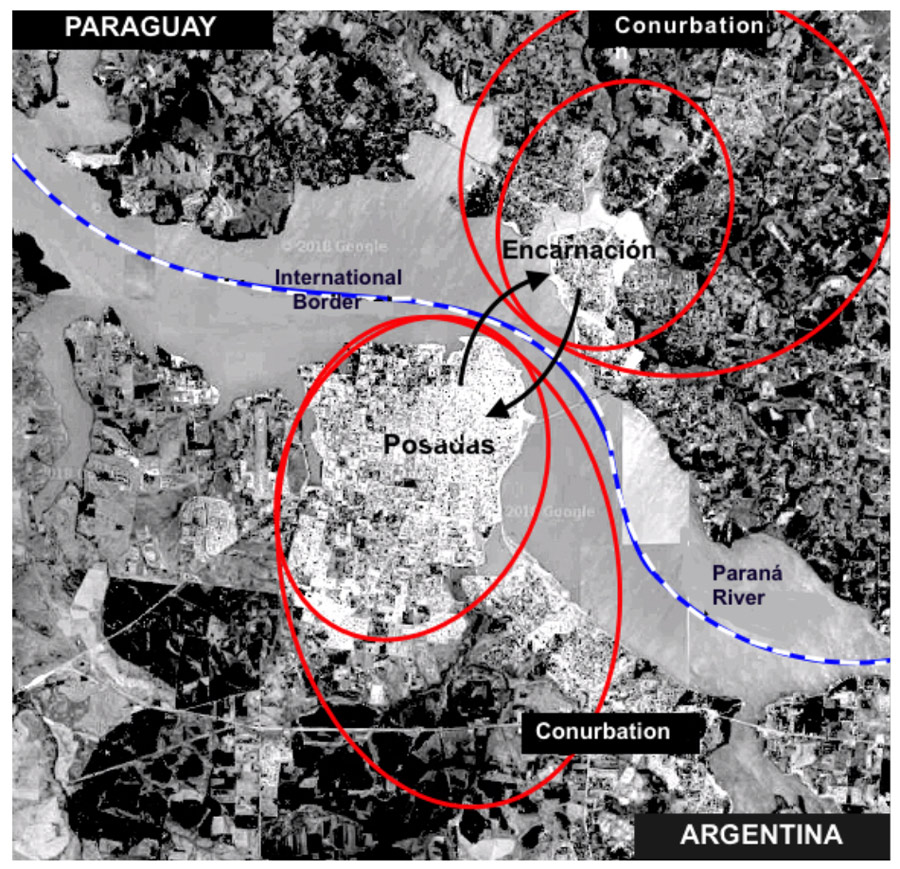 Far from being an “integrationist” proposal of twin cities, I argue that Posadas and Encarnación have relational processes that are characterized by asymmetries and differences regarding the socio-economic and cultural spheres but also by complementary and regular exchange rationales, cross-border flows of commerce (both formal and informal), job opportunities, health and education services, urban transportation systems, and infrastructure networks, among others. This scenario provides us with a complex urban cross-border reality (Figure 1).