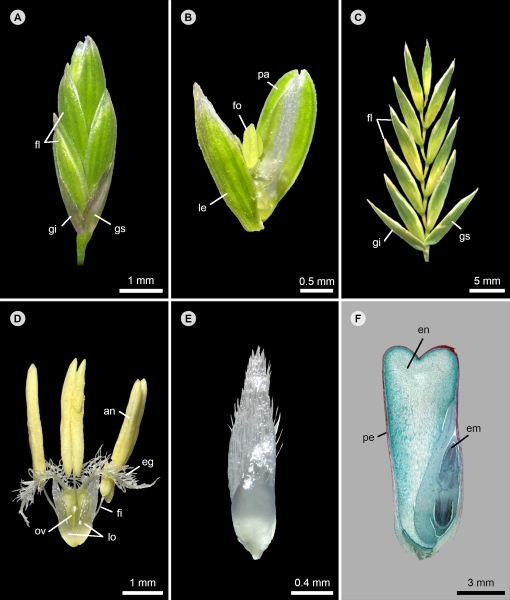 Figura 1: Sinapormorfías morfológicas de Poaceae. A. espiguilla de Glyceria striata (Lam.) Hitchc.; B. flósculo de G. striata; C. espiguilla de Bromus catharticus Vahl., mostrando la disposición de las glumas y flósculos; D. flor de Brachypodium mexicanum (Roem. & Schult.) Link; E. lodícula de B. mexicanum; F. corte longitudinal de la cariópside de Zea mays L. an: antera, eg: estigma, em: embrión. en: endospermo, fi: filamento, fl: flósculo, fo: flor, gi: gluma inferior, gs: gluma superior, le: lema, lo: lodículas, ov: ovario, pa: pálea, pe: pericarpo. Fotografías de J.L. Vigosa-Mercado y M. Clayton (F).