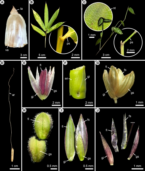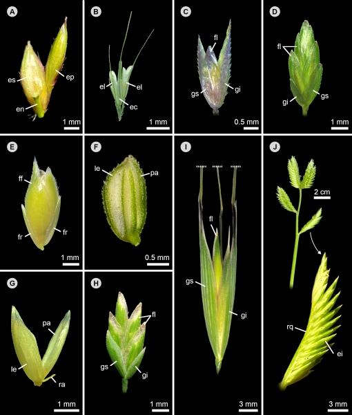 Respecto a su sistemática, las gramíneas son reconocidas como un grupo natural y homogéneo, debido a sus sinapomorfías morfológicas, que incluyen a las flores organizadas en unidades bracteadas llamadas espiguillas, el perianto representado por lodículas, frutos generalmente de tipo cariópside y embriones altamente diferenciados al momento de la dispersión de los frutos (GPWG et al., 2001) (Fig. 1). Se sugiere consultar los trabajos de Dahlgren et al. (1985), Clayton y Renvoize (1986), Watson et al. (1992), GPWG et al. (2001) y Kellogg (2015), para conocer más generalidades de la familia. Los primeros sistemas de clasificación del grupo se basaron en las características morfológicas (p. ej., Bentham y Hooker, 1883; Hitchcock, 1920, 1935), posteriormente se incorporaron fuentes de información como la anatomía, citología y embriología (p. ej., Dahlgren et al., 1985; Clayton y Renvoize, 1986; Watson et al., 1992), y más recientemente la evidencia molecular (p. ej., GPWG et al., 2001; Kellogg, 2015; Soreng et al., 2015, 2017, 2022). La propuesta de clasificación más reciente es la de Soreng et al. (2022), en la que se reconocen 12 subfamilias, 54 tribus y 109 subtribus.