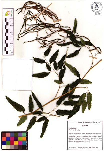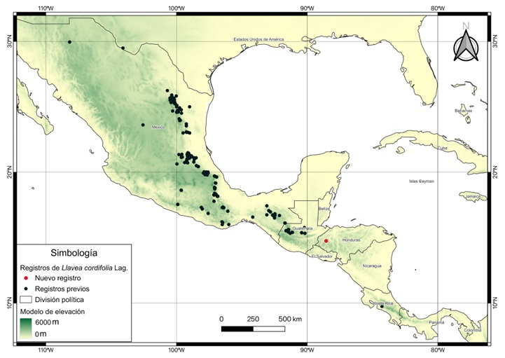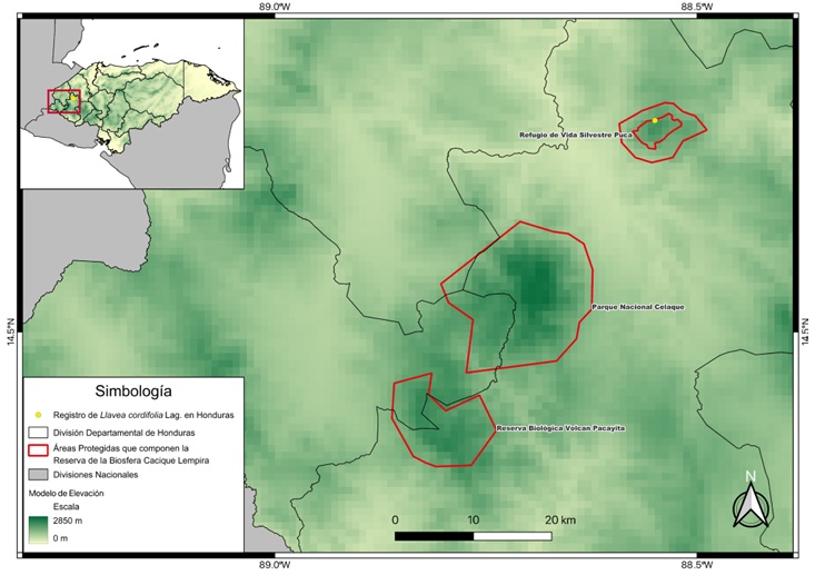 Llavea Lag. es un género monotípico representado únicamente por Llavea cordifolia Lag., que pertenece a la familia Pteridaceae y a la subfamilia Cryptogrammoideae (PPGI, 2016). La especie cuenta con una detallada historia en la horticultura europea, usos medicinales y potencial para uso comercial (ver Hoshizaki y Moran, 2001; Palacios-Rios et al., 2016). Llavea cordifolia se caracteriza por su morfología distintiva, con hojas fértiles hemidimorfas (Grajales-Tam y Tejero-Díez, 2024) y por su afinidad por hábitats específicos, particularmente sustratos calizos y bosques de montaña rocosos (Palacios-Rios et al., 2016). Este tipo de hábitats existen en Honduras; no obstante, la especie presentaba una distribución disyunta entre México-Guatemala y Costa Rica (Palacios-Rios et al., 2016). Con base en una colecta desarrollada en el marco de giras de monitoreo en el Refugio de Vida Silvestre Puca, se reporta el primer registro de la especie para Honduras, cerrando su distribución disyunta en Mesoamérica.