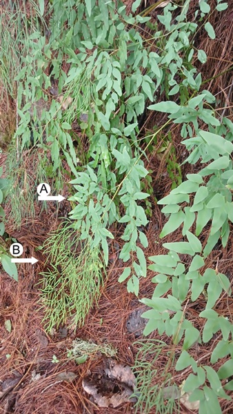 Figura 2: Hábitat y morfología distintiva de Llavea cordifolia Lag. (Vega y Aleman 2996; TEFH). A. hojas infértiles, ovadas con márgenes serrulados; B. hojas fertiles semidimorfas, recurvadas y con soros pseudo acrostichoides. Foto por H. Vega.