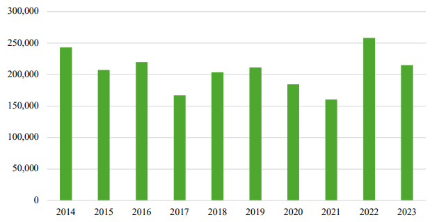 El presente artículo es resultado de una investigación sobre cómo las personas adultas mexicanas expulsadas de Estados Unidos (re)construyen su sentido de pertenencia en su país de nacimiento. El tema es crucial en el campo de las migraciones forzadas debido a la complejidad de las deportaciones masivas y su impacto tanto a nivel individual como comunitario.2 De acuerdo con las estadísticas de la Unidad de Política Migratoria, Registro e Identidad de las Personas (UPMRIP, 2024), durante la década de 2014 a 2023 hubo más de 2 millones de eventos de personas mexicanas devueltas (deportadas) desde Estados Unidos hacia México (gráfica 1), con un promedio de más de 200 000 anuales.