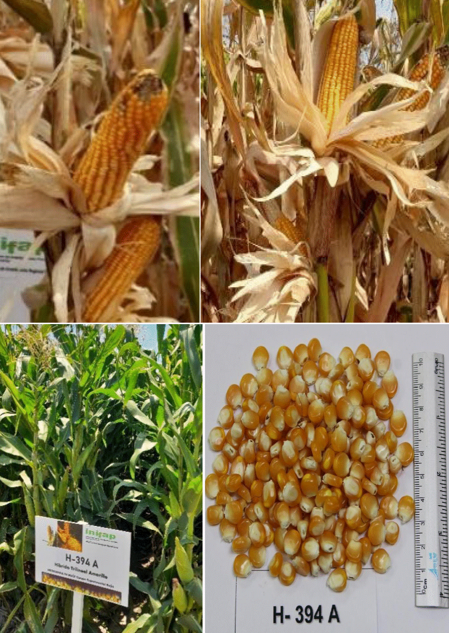 El H-394 A está formado por los progenitores del H-387 A (Preciado-Ortiz et al., 2019) dispuestos en otro orden, con lo que se facilita la producción de semilla, ya que la línea LAB 1, que participaba como progenitor masculino en el H 387 A, interacciona más con el ambiente de producción y presenta siete días de asincronía floral con respecto al progenitor femenino; por lo tanto, para la producción del H-394 A existe una completa sincronía entre ambos progenitores. Esta nueva combinación del progenitor femenino de cruza simple (CML 451 × LAB 1) × la línea CML 481 como progenitor masculino crea un híbrido diferente que mantiene las características de calidad, rendimiento y adaptación.