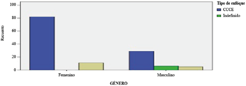 En consecuencia, se ha elaborado una tabla de contingencia, como se mencionó en el apartado de "procedimiento de recogida y análisis de datos", donde se presentan los resultados acerca del tipo de enfoque de enseñanza y aquellos correspondientes a la variable género. A partir de la tabla 3, es posible observar que el enfoque de enseñanza CCCE, predomina sobre el enfoque TICP; el primero con un puntaje total de 111 y el segundo con 16.