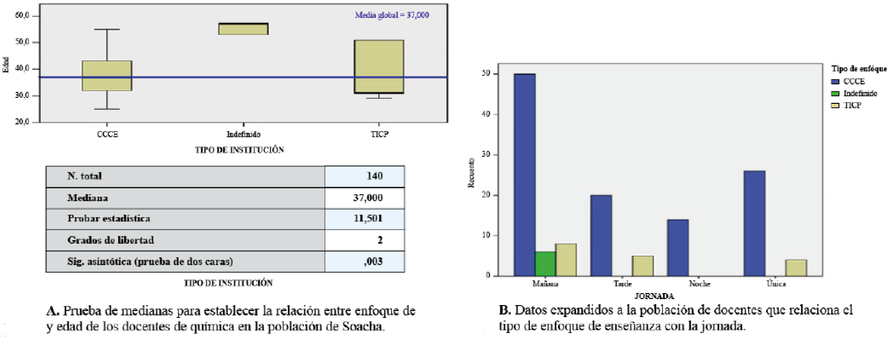Para la construcción de las gráficas se partió de los datos obtenidos para todos los docentes que participaron, se procesaron estadísticamente con el software SPSS versión 20, luego de los procedimientos anteriores, para cada una de las variables sociodemográficas, se ha comprobado en primera instancia, si se cumple el supuesto de distribución normal de los datos; de ser así, se procede al diseño de una tabla de contingencia y la prueba de independencia para asegurar que existe algún tipo de relación entre el enfoque de enseñanza y la variable en cuestión y luego analizar esta relación ( H1); de no ser así, se acepta la ausencia de cualquier relación (H0).