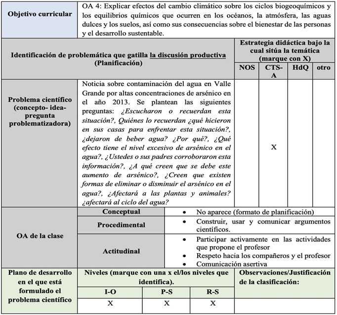 Se llevó a cabo en primera instancia, la sistematización de las preguntas/enunciados destacada en las planificaciones como promotoras de la discusión productiva, utilizando la matriz de análisis elaborada para esta investigación (extracto en Figura 1) a partir de la rúbrica de Quintanilla (2019a), la cual integro el OA curricular (de acuerdo al nivel de enseñanza), el objetivo de la clase (conceptual, procedimental y actitudinal), las estrategias/ enfoques bajo el cual se desarrolló la discusión productiva (Naturaleza de la Ciencia NOS, Contextos CTSA, Historia de la Química HdQ, u otro que corresponde a contexto cotidiano) y el plano de desarrollo del pensamiento científico identificado. De aquellas en las que se identificó el enfoque/ estrategia HdQ, CTS-A y/o NOS, se realizó el análisis exhaustivo de la planificación completa utilizando el software atrás ti.