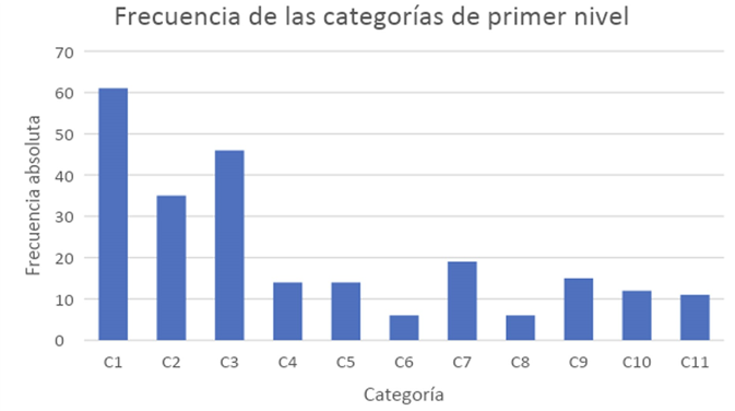 La mayor frecuencia descrita para algunas categorías respecto a otras, se explica por la naturaleza de cada una de las categorías agrupadas. Por ejemplo, C1, C2 y C3 indican la carga teórica con la que el profesorado planificó preguntas, actividades del profesor y del estudiantado, así como los tipos de evaluación y sus indicadores, por lo que en una pregunta es posible identificar la carga teórica en I-O (C1), P-S (C2) y R-S (C3), por separado o las tres juntas. Mientras que, en C11, que incluye parte de las planificaciones docentes que hacen referencia a la discusión como un momento de la PGDP, se describen actividades de larga duración y que relacionan los diferentes apartados de las planificaciones, en los que es posible integrar varias categorías dentro de ellas.