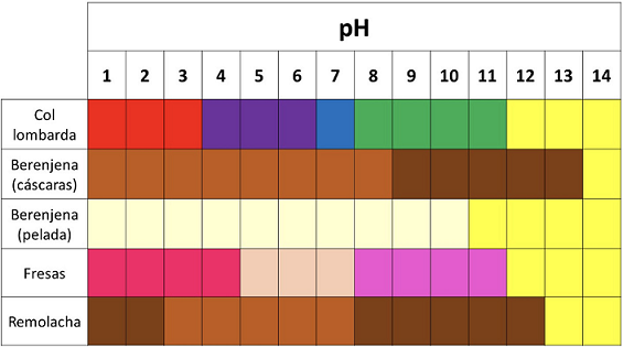 Los pigmentos naturales determinan los colores de las diferentes sustancias debido a la presencia de sus grupos cromóforos, quienes capturan energía de la luz natural excitando electrones desde orbitales de baja energía a orbitales superiores, reflejando la energía no absorbida como un color visible para el ojo humano (Rodríguez-Mena et al. 2023). En el caso específico de los vegetales, sus colores provienen de la interacción de la luz visible con tres compuestos químicos característicos: clorofilas, carotenoides y antocianinas, responsables de los colores verdosos, amarillentos/rojizos y azulados/ violáceos tanto en frutas y verduras como en plantas y flores (Delgado-Vargas et al., 2000). La naturaleza e intensidad de los colores en los pigmentos naturales dependen de muchos factores, por ejemplo, la concentración de éstos en una determinada especie o los valores de pH del medio. En general, muchos pigmentos naturales o artificiales se utilizan como indicadores de pH en diversos protocolos de laboratorio (Chigurupati et al. 2002; Abugri et al. 2012; Macuvele et al. 2016; Foster y Gruntfest 1937; Foster 1978; Linder et al. 2019) y también se utilizan para fabricar tiras de pH, que fácilmente se obtienen sumergiendo un papel absorbente en extractos acuosos del pigmento en cuestión y dejando secar (Casas Mateu et al, 2009; Metheny et al, 2017).