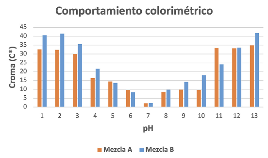 Todas las mediciones se realizaron por triplicado para recopilar datos representativos. Los valores promedio de C* se obtuvieron para las mezclas de extractos A y B (explicadas más adelante en el texto, en la sección de Resultados y discusión) y para cada valor de pH. A partir del análisis de los datos se determinó el comportamiento del parámetro en función de los valores de pH.