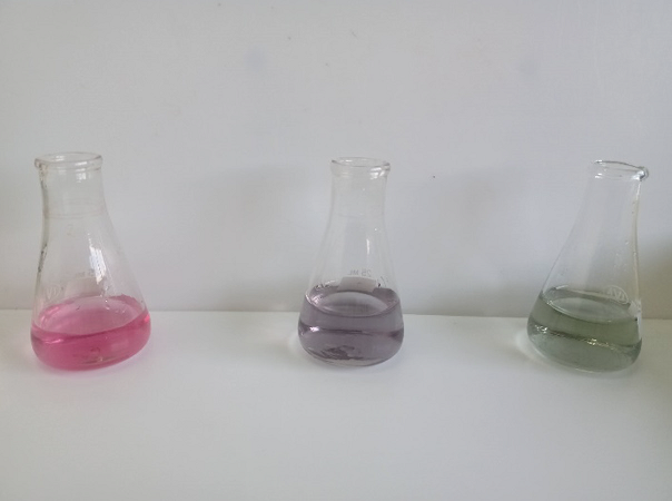 Figura 6 Colores obtenidos para la titulación ácido/base empleando la Mezcla B como indicador. Antes (izquierda) y después (derecha) del punto de equivalencia (centro).