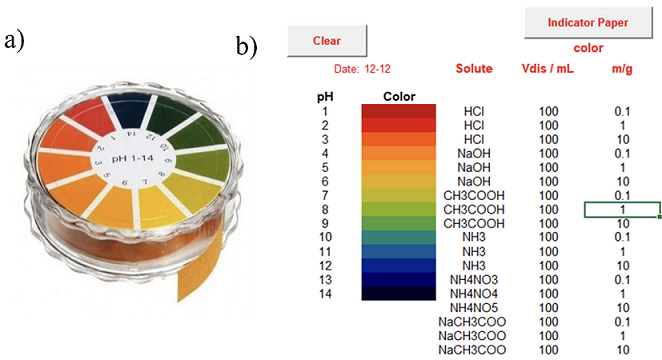 Figura 1 a) Papel indicador utilizado en la práctica. b) Hoja de cálculo Excel para la determinación del pH de disoluciones.