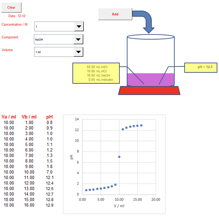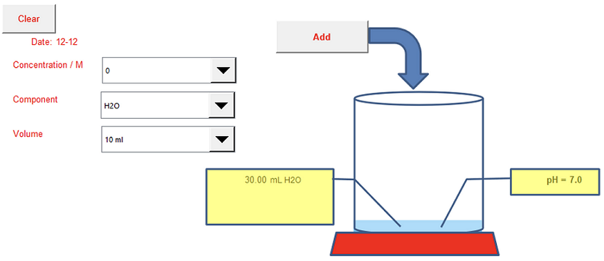 Seleccionar el componente a añadir, su volumen y su concentración. Si se agrega agua o sustancia indicadora, su concentración es irrelevante. Si se añade HCl y se especifica c=0 M, se generará un valor aleatorio de concentración desconocida. El conocimiento de dicho valor es el objetivo que persigue el uso de esta pestaña de la hoja de cálculo.