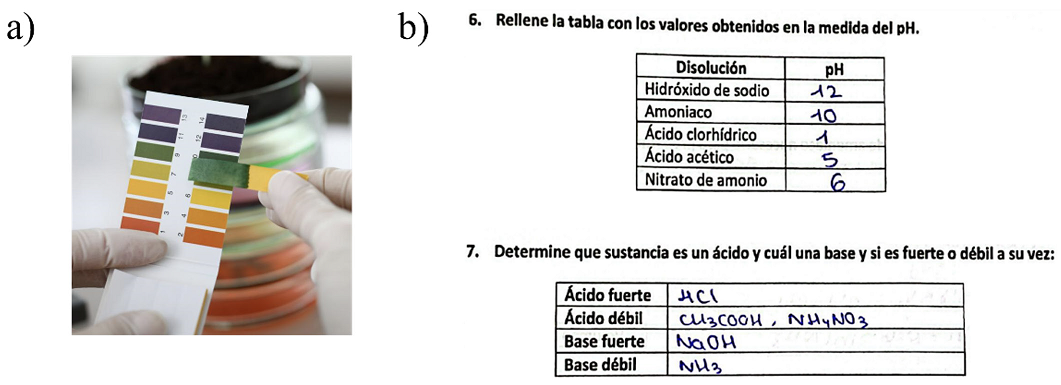 Figura 3 a) Estimación visual del pH de una disolución mediante el color de tiras de papel indicador. b) Detalle del cuaderno de laboratorio del alumno.