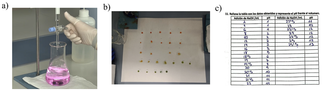 Figura 4 a) Instantánea de la acidimetría en su punto final. b) Variación del color del papel indicador según se va adicionando la base sobre el ácido. c) Fragmento del cuaderno de laboratorio del alumno.