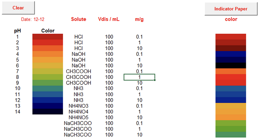 “Indicator paper” activará la generación de un color en la columna “color” en función del pH de la disolución resultante (determinado a partir de Vdis y masa de soluto)