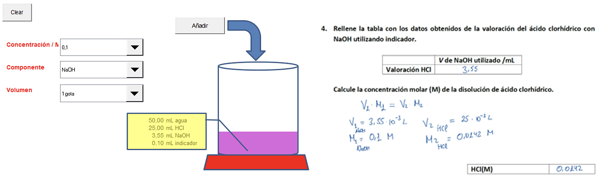 Figura 7 Resultados obtenidos por el alumno al nutrir de datos de entrada la pestaña “valor” y detalle de cálculos de concentraciones manuscritos durante las neutralizaciones.