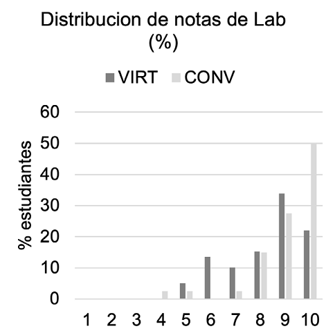 Los resultados académicos para ambos grupos confirman resultados similares (VIRT/CONV: 75/68 estudiantes, 2,8/4,1 calificación final media, 8,0/8,7 calificación laboratorio promedio). El análisis de similaridad muestra que las distribuciones entre las notas de laboratorio y las finales son muy diferentes para ambos grupos, sin embargo, dicho test no consigue diferenciar las distribuciones de notas de los dos grupos de laboratorio, confirmando la equivalencia en los resultados obtenidos.