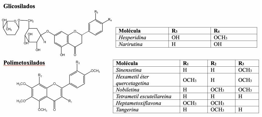 En la Figura 1 se muestra las estructuras de los flavonoides glicosilados y polimetoxilados, los cuales representan la mayor concentración de flavonoides en la cáscara, como la hesperidina, narirutina y naringina. Éstos se localizan en la capa blanca que hay entre la cáscara y los gajos de la naranja. Las moléculas polimetoxiladas como la sinensetina, haxametil éteres quercetagetina, nobiletina, tretrametil y tangeretina están presentes en el flavedo (capa exterior colorida de la naranja (Da Silva et al., 2015).