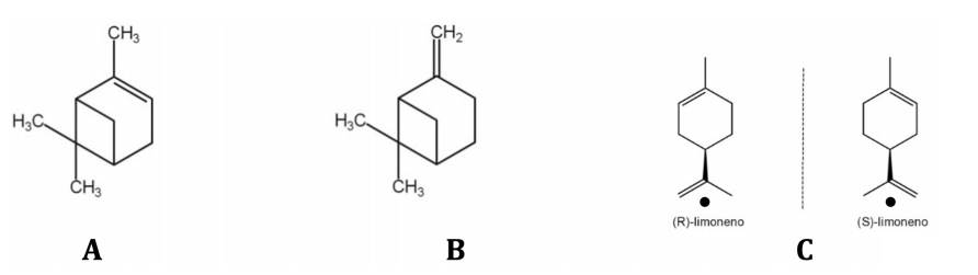 Figura 3 Estructura química del α-pineno (A), β-pineno (B), (C) R-limoneno y S-limoneno.