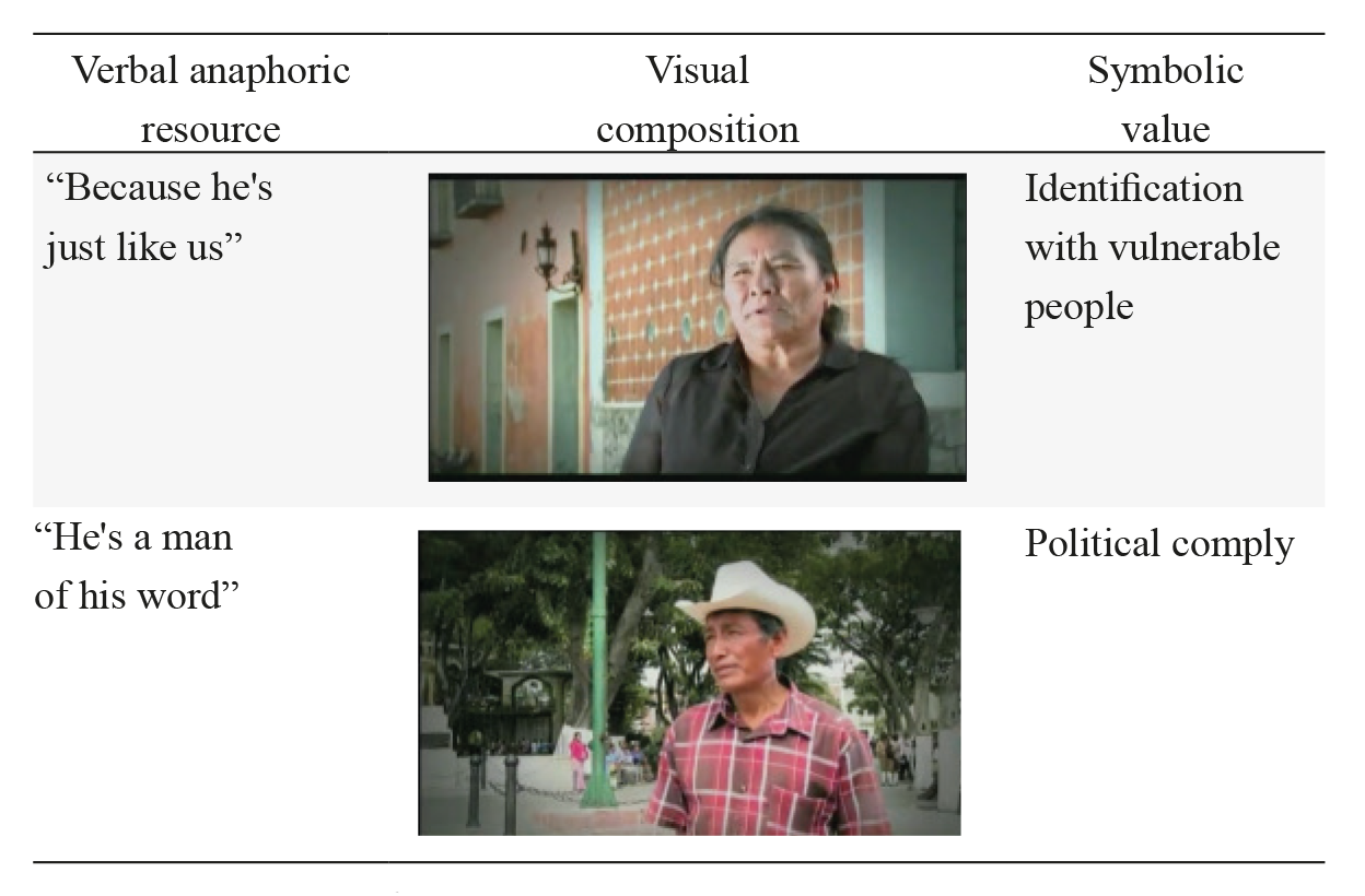 The dynamic configuration of political discourse requires emphasizing the political actors attributes, especially in audiovisual media, since the logic of semiotic articulation of the spots also implies image´s rhetoric. Thus, the presentation spots consider anaphoric resources, at the different levels of multimodality. In the spot "Puebla gana", the copulative verb "es" serves as basis for the attributes description: "igual", "confiable", "humilde", "seria y comprometida". The symbolic values, therefore, are the result of the rhetorical strategy: "identidad", "confianza ciudadana", "origen humilde" and "compromiso". Another anaphoric resource is the systematic presence of women, whose multiplicity roles values reinforce the plausibility of discourse. The media rhetoric, as seen in the spots of Compromiso por Puebla and Alianza Puebla Avanza, present the modality described by Lebel (2003) as "image control", understood as the political actors’ image configuration, from a given discursive intentionality, through the use of media techniques.
