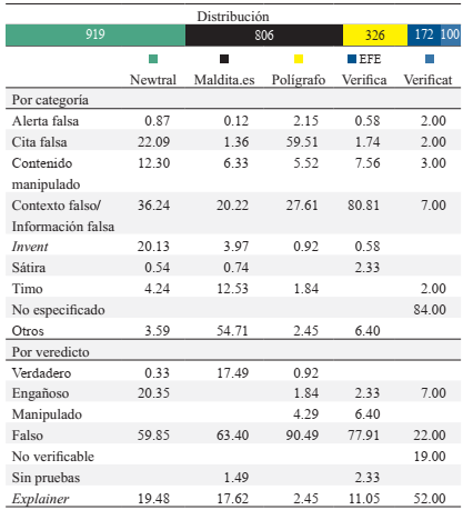 De todas las categorías, la que se repite con una mayor incidencia es la de “Contexto falso / Información falsa”, que se corresponde, por orden, al 80.81 % del contenido de EFE Verifica, al 36.24 % del de Newtral, al 27.61 % de Polígrafo y al 20.22 % de Maldita.es. Solo se observa una incidencia menor en Verificat, con un 7 %. Tras ella, aparecen otras categorías destacadas como “Cita falsa”, que se da en el 59.51 % del contenido de Polígrafo y el 22.09 % del de Newtral.